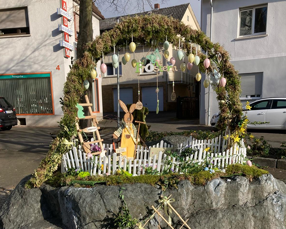 Eine tolle Idee! Ehemalige Volleyballerinnen schmückten zum Osterfest den Brunnen in der Naunheimer Ortsmitte.
